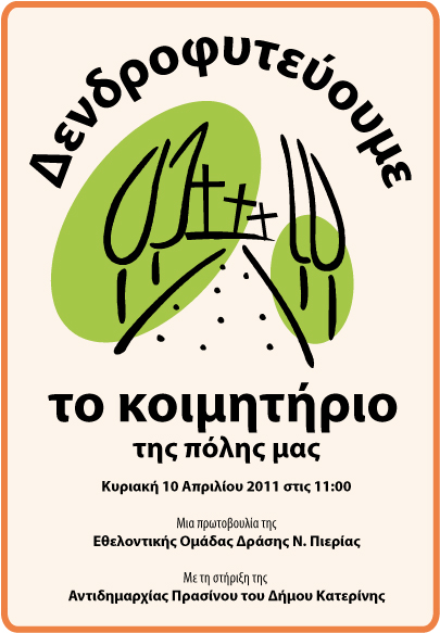 Πριν 6 εβδομάδες περίπου, προτείναμε στο Δήμο Κατερίνης να δενδροφυτεύσουμε το νέο κοιμητήριο της πόλης μας. Μετά από συνεννόηση με την αντιδήμαρχο κ. Μπατάλα – Τζουμέρκα Καλλιόπη και τους υπαλλήλους της υπηρεσίας, βρισκόμαστε στην ευχάριστη θέση να σας ανακοινώσουμε, πως η δενδροφύτευση θα πραγματοποιηθεί την επόμενη Κυριακή 10 Απριλίου 2011, στις 11:00 στο χώρο του νέου κοιμητηρίου της πόλης μας (Δίπλα στο συνεταιρισμό Επιπλοποιών).