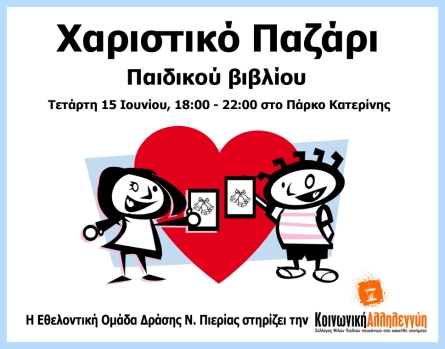 Ο σύλλογος φίλων παιδιών πασχόντων από κακοήθη νοσήματα «Κοινωνική Αλληλεγγύη», στην προσπάθειά του να στηρίξει και να προστατεύσει με κάθε θεμιτό μέσο, παιδιά που πάσχουν από κακοήθη νοσήματα και τις οικογένειές τους, διοργανώνει την Τετάρτη 15 Ιουνίου 2011 από τις 18:00 ως τις 22:00 εκδήλωση αγάπης στο Πάρκο Κατερίνης. Η Εθελοντική Ομάδα Δράσης Ν. Πιερίας, όπως και στο παρελθόν, στηρίζει την προσπάθεια της «Κοινωνικής Αλληλεγγύης», φέτος, με την οργάνωση «Χαριστικού Παζαριού παιδικών βιβλίων»θα λειτουργήσει επίσης την 15η Ιουνίου 2011, από τις 18:00 έως τις 22:00. το οποίο θα στηθεί στη είσοδο του Πάρκου Κατερίνης και Η Εθελοντική Ομάδα Δράσης Ν. Πιερίας καλεί τα μέλη, τις φίλες και τους φίλους της να στηρίξουν την προσπάθεια αυτή και να συμβάλλουν στον αγώνα στήριξης των παιδιών. Φέρτε λοιπόν παιδικά βιβλία που δεν χρειάζεστε πλέον, τα οποία όμως πρέπει να βρίσκονται σε καλή κατάσταση, και χαρίστε τα για να τα διαβάσουν κι άλλα παιδιά, που ίσως δεν έχουν τη δυνατότητα να τα αγοράσουν. Όσα βιβλία περισσέψουν, θα παραδοθούν στη Δημοτική Βιβλιοθήκη της πόλης μας. Καλούνται τα μέλη της δράσης "Φίλοι της Δημοτικής Βιβλιοθήκης" της ΕΟΔνΠ να συνδράμουν στην οργάνωση της παραπάνω δραστηριότητας. Εθελοντική Ομάδα Δράσης Ν. Πιερίας |