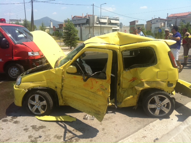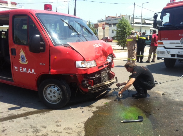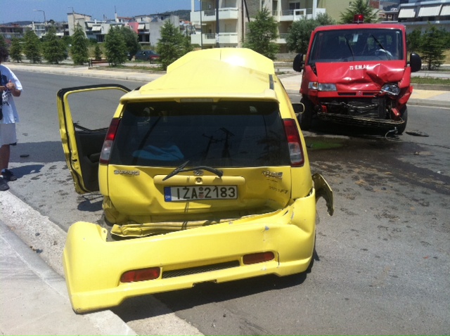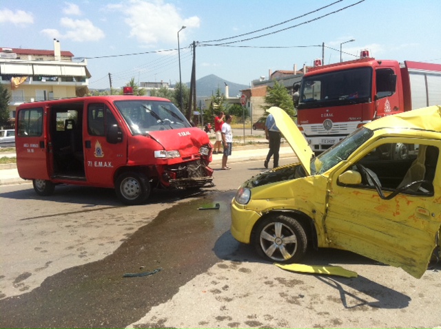 Η οδηγός από το κίτρινο suzuki κατέβαινε την Αμφικτυόνων και συγκρούστηκε με το όχημα της ΕΜΑΚ στο οποίο επέβαιναν 8 άνδρες, οι οποίοι πήγαιναν στην πυρκαγιά στη Μακρακώμη.