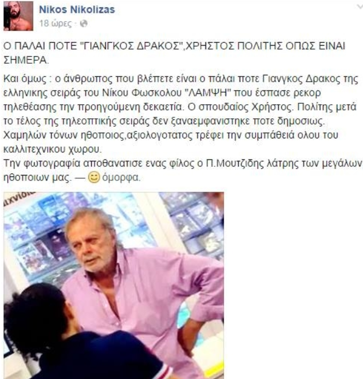 Ο ρόλος του στη «Λάμψη» ήταν και η τελευταία του τηλεοπτική δουλειά. Από τότε δεν έχει εμφανιστεί στην τηλεόραση, ωστόσο ο δημοσιογράφος Νίκος Νικόλιζας με την ανάρτηση μιας φωτογραφίας του στο Facebook μας δίνει τη δυνατότητα να δούμε πώς είναι σήμερα ο... Γιάγκος Δράκος.