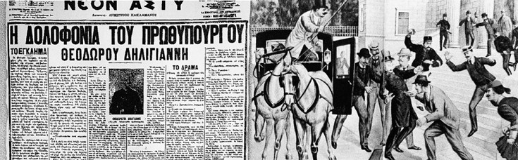 Η δολοφονία του Θεόδωρου Δηλιγιάννη από πρώην λεσχηάρχη και χαρτόμουτρο στα σκαλοπάτια της Βουλής προσυπέγραψε ίσως γλαφυρά ένα από τα δραματικότερα γεγονότα της σύγχρονης ελληνικής πολιτικής ιστορίας: 64 χρόνια μετά την τραγική δολοφονία του Ιωάννη Καποδιστρία στο Ναύπλιο, ο πρωθυπουργός της χώρας έπεφτε και πάλι νεκρός.