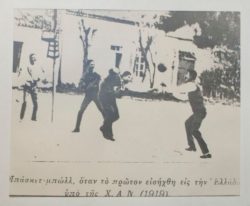 Την καταγραφή αυτή συνοδεύει μια ιστορική φωτογραφία εκείνης της χρονιάς που δείχνει στελέχη της Y.M.C.A. (Χριστιανική Αδελφότης Νέων) να εξασκούνται στο νέο άθλημα χρησιμοποιώντας για καλάθι μια ξύλινη καρέκλα κρεμασμένη ανάποδα σ έναν στύλο.
