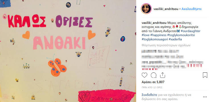 Συγκεκριμένα δημοσίευσε μία φωτογραφία που έδειχνε την ζωγραφιά που έφτιαξε ανιψιός της για την μικρή. «Καλώς Όρισες Ανθάκι» έγραφε η ζωγραφιά, η οποία είχε επάνω της ζωγραφισμένες πεταλούδες.