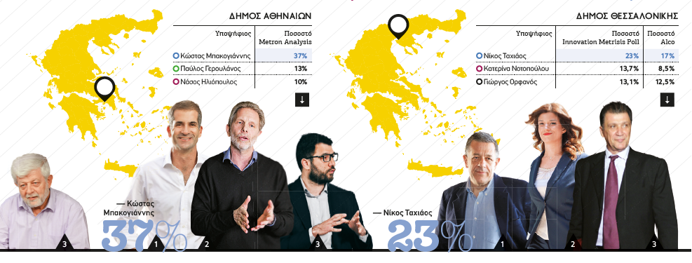 Η συντριβή του ΣΥΡΙΖΑ στις αυτοδιοικητικές εκλογές διαφαίνεται και σε επίπεδο κεντρικών δήμων. Στην Αθήνα, όπου το 2014 ο Γ. Σακελλαρίδης είχε ηττηθεί στον β’ γύρο από τον απερχόμενο δήμαρχο, Γ. Καμίνη, με 3%, στις επερχόμενες εκλογές ο εκλεκτός της Κουμουνδούρου θα δει τον β’ γύρο από την τηλεόραση. Σύμφωνα με το βαρόμετρο της Metron Analysis, παίρνει 10%, υποτριπλάσιο του Κ. Μπακογιάννη, χάνοντας την είσοδο στον β’ γύρο από τον Π. Γερουλάνο.
