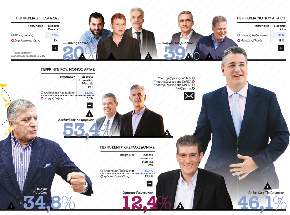 Εκτός β’ γύρου εμφανίζεται να βρίσκεται ο υποψήφιος του ΣΥΡΙΖΑ στην Περιφέρεια Στερεάς Ελλάδας, Δ. Αναγνωστάκης, ο οποίος σε μέτρηση της PRORATA συγκεντρώνει 8%, πολύ μακριά από το δίδυμο Γκλέτσου – Σπανού, που έχει Στην Περιφέρεια Ν. Αιγαίου, αντιθέτως, ο υποψήφιος του ΣΥΡΙΖΑ, Μ. Γλυνός, ναι μεν, περνάει στον β’ γύρο, αλλά σε μέτρηση της ALCO υπολείπεται σαφώς του νυν περιφερειάρχη, Γ. Χατζημάρκου.