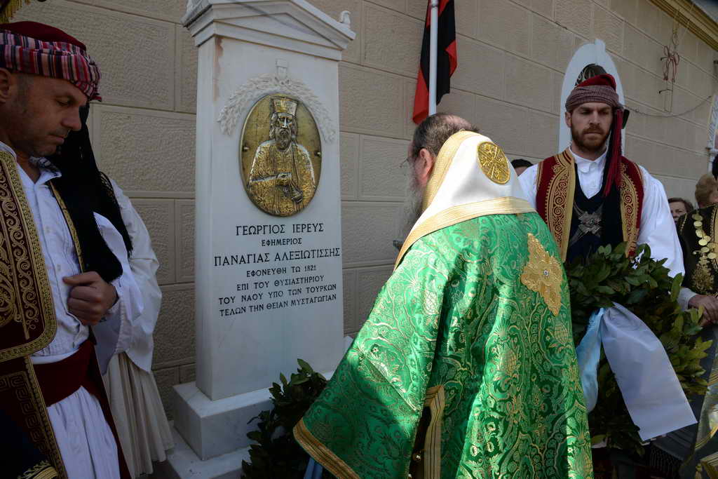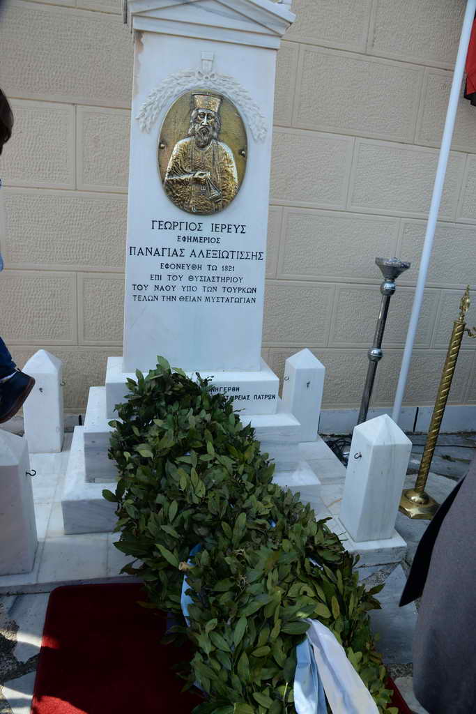 Μετά τήν Θεία Λειτουργία ὁ Σεβασμιώτατος, οἱ λοιποί Κληρικοί, οἱ Ἀρχές τοῦ τόπου καί ὁ Λαός, ἀπότισαν φόρο τιμῆς πρός τόν Ἐθνομάρτυρα Ἱερέα, μπροστά στό μνημεῖο πού ἒχει στηθεῖ στό προαύλιο τοῦ Ναοῦ, ἀπό τήν Ἀχαϊκή Ἑταιρεία Πατρῶν, τό ἒτος 1971.