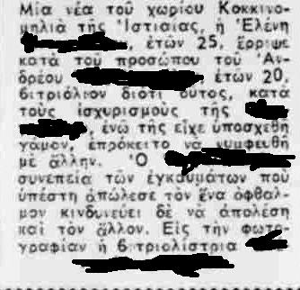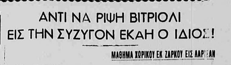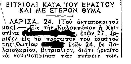 Την ίδια μέρα στην εφημερίδα “Ελευθερία” ρεπορτάζ αναφέρονταν σε κοπέλα στη Λάρισα που έριξε βιτριόλι στον εραστή της, με το καυστικό υγρό να μην σημαδεύει μόνο εκείνον αλλά να βρίσκει και ανυποψίαστη γυναίκα που είχε την ατυχία να περνά εκείνη την ώρα από δίπλα τους.