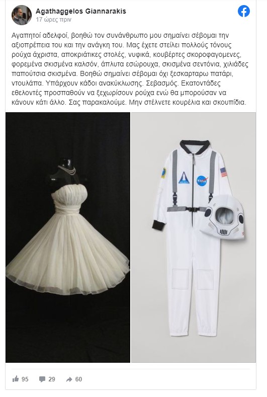 «Αγαπητοί αδελφοί, βοηθώ τον συνάνθρωπο μου σημαίνει σέβομαι την αξιοπρέπεια του και την ανάγκη του. Μας έχετε στείλει πολλούς τόνους ρούχα άχριστα, αποκριάτικες στολές, νυφικά, κουβέρτες σκοροφαγομενες, φορεμένα σκισμένα καλσόν, άπλυτα εσώρουχα, σκισμένα σεντόνια, χιλιάδες παπούτσια σκισμένα. Βοηθώ σημαίνει σέβομαι όχι ξεσκαρταρω πατάρι, ντουλάπα. Υπάρχουν κάδοι ανακύκλωσης. Σεβασμός. Εκατοντάδες εθελοντές προσπαθούν να ξεχωρίσουν ρούχα ενώ θα μπορούσαν να κάνουν κάτι άλλο. Σας παρακαλούμε. Μην στέλνετε κουρέλια και σκουπίδια».