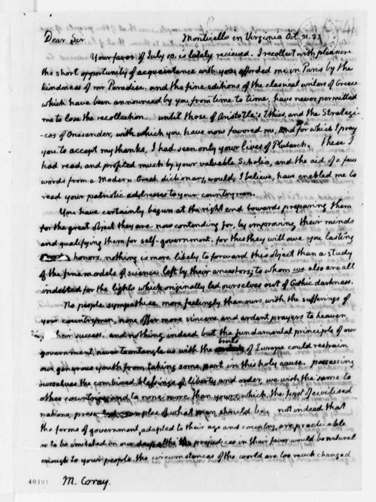 «Τα αιτήματα του Κοραή θα δώσουν στον Τζέφερσον, ο οποίος είναι πλέον ογδόντα ετών, την ευκαιρία να συνοψίσει με απόλυτη διαύγεια όχι μόνο τι έχει επιτευχθεί στη χώρα του για να γίνει πράξη η λαϊκή κυριαρχία αλλά και τι φρονεί ότι θα πρέπει να γίνει προκειμένου η νομοθετική και η δικαστική εξουσία να μην στραφούν εναντίων των πολλών από τους οποίους αντλούν τη νομιμοποίησή τους. Με αυτό το πνεύμα θα εξάρει τη μονοπρόσωπη εξουσία που ασκεί ο Πρόεδρος των ΗΠΑ ως αντίδοτο στον φατριασμό. Παράλληλα, όμως, θα προτείνει αλλαγές στον τρόπο εκλογής και λειτουργίας της Γερουσίας και της Βουλής των Αντιπροσώπων, έτσι ώστε τα μέλη τους να μην μπορούν να αποτελέσουν προνομιούχο τάξη, και θα ζητήσει οι δικαστές να διορίζονται με συγκεκριμένη θητεία και να λογοδοτούν προκειμένου να μην υπονομεύουν με τις αποφάσεις τους το Σύνταγμα. Έτσι, η επιστολή της 31ης Οκτωβρίου 1823 που απέστειλε στον Κοραή είναι πολύτιμη και για την κατανόηση της ύστερης πολιτικής σκέψης του ιδίου του Τζέφερσον».
