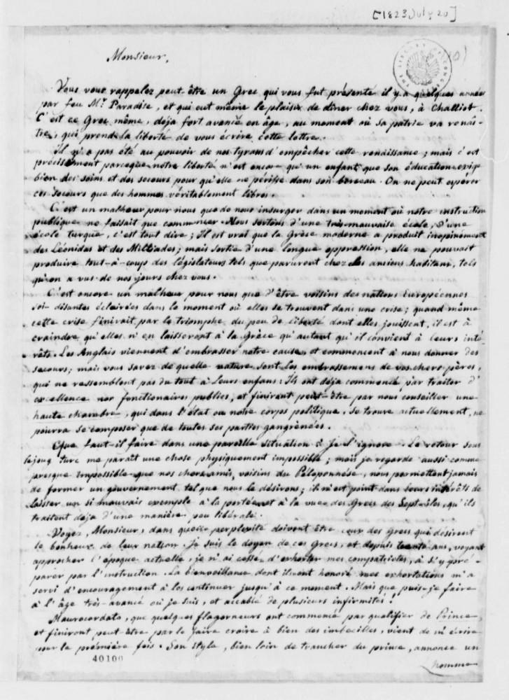 την αλληλογραφία του κορυφαίου Έλληνα διαφωτιστή Αδαμάντιου Κοραή με τον τρίτο Πρόεδρο των Ηνωμένων Πολιτειών και συγγραφέα της Διακήρυξης της Ανεξαρτησίας Τόμας Τζέφερσον, η οποία έλαβε χώρα τη διετία 1823-1825 και για την οποία δεν θα ήταν υπερβολή να πει κανείς πως έως σήμερα ήταν παραμελημένη στη Βιβλιοθήκη του Αμερικανικού Κογκρέσου.