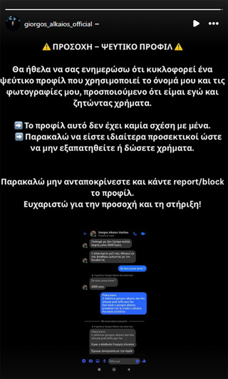 «Παρακαλώ μην ανταποκρίνεστε και κάντε report/block το προφίλ», τονίζει ο Γιώργος Αλκαίος, ευχαριστώντας τους θαυμαστές του για την προσοχή και τη στήριξη.