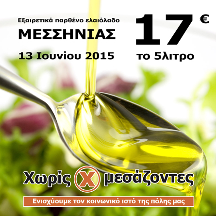 Το Σάββατο, 13 Ιουνίου 2015, στον χώρο της Εμποροπανήγυρης Κατερίνης, θα πραγματοποιηθεί διανομή εξαιρετικά παρθένου ελαιόλαδου Μεσσηνίας «Χωρίς Μεσάζοντες» από την Εθελοντική Ομάδα Δράσης Ν. Πιερίας. Πρόκειται για...