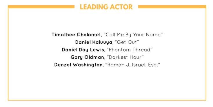 Ο Τιμοθι Σαλαμέ για το «Call Me by Your Name», ο Ντάνιελ Ντέι-Λιούις για το «Phantom Thread», ο Γκάρι Όλντμαν για το «Η πιο σκοτεινή ώρα», ο Ντάνιελ Καλούγια για το «Get Out» («Τρέξε!»), ο Ντένζελ Ουάσινγκτον για το «Roman J. Israel, Esq.».