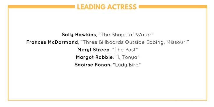Η Σάλι Χόκινς για το «Σχήμα του νερού», η Φράνσες ΜακΝτόρμαντ για το «Τρεις πινακίδες έξω από το Έμπινγκ στο Μιζούρι», η Μάργκοτ Ρόμπι για το «Εγώ, η Τόνια», η Σίρσα Ρόναν για τo «Lady Bird», η Μέριλ Στριπ για το «The Post: Απαγορευμένα Μυστικά».