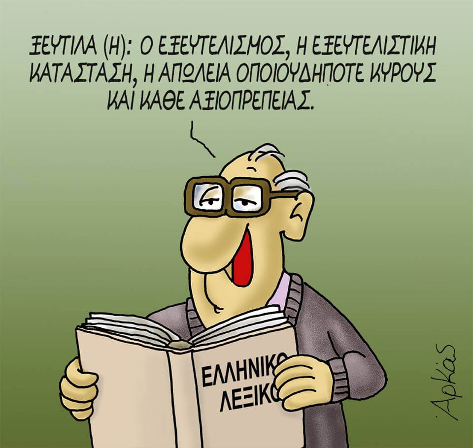 γνωστός σκιτσογράφος εμφανίζει έναν άνδρα να διαβάζει στο λεξικό τον ορισμό της λέξης «ξευτίλα».