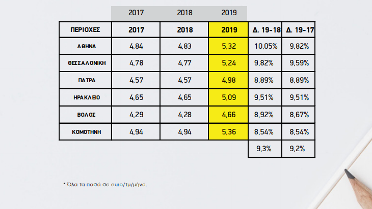 Αναλυτικότερα, η Κομοτηνή καταγράφει την υψηλότερη αξία μονάδας με 5,36 euro/τμ/μήνα. Ακολουθεί η Αθήνα με 5,32 euro/τμ/μήνα, η Θεσσαλονίκη με 5,24 euro/τμ/μήνα, το Ηράκλειο με 5,09 euro/τμ/μήνα, η Πάτρα με 4,98 euro/τμ/μήνα και τέλος ο Βόλος με 4,66 euro/τμ/μήνα.