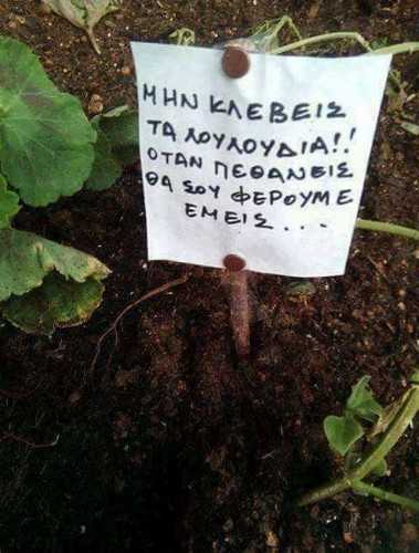 Βρήκαμε, όμως, την πιο… μακάβρια πινακίδα που έχει υπάρξει ποτέ σε ελληνικό κήπο… Το μήνυμα της πινακίδας είναι ξεκάθαρο κι απολύτως κατανοητό!