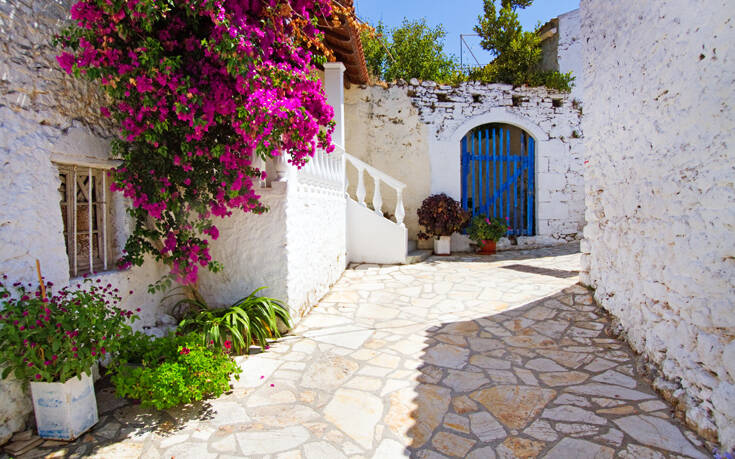 Ο βράχος όπου είναι χτισμένο το χωριό καταλήγει σε έναν μικρό ισθμό, με παραλίες εκατέρωθεν, γνωστός και ως Πόρτο Τιμόνι. Οι ακρογιαλιές δεν είναι ορατές από το χωριό και προσεγγίζονται μέσω μονοπατιών και μιας διαδρομής που διαρκεί περίπου 30-40 λεπτά. Κατά το μήκος της συναντώνται μεσαιωνικά ερείπια, καθώς και το εξωκλήσι του Άγιου Στυλιανού μέσα σε σπηλιά.