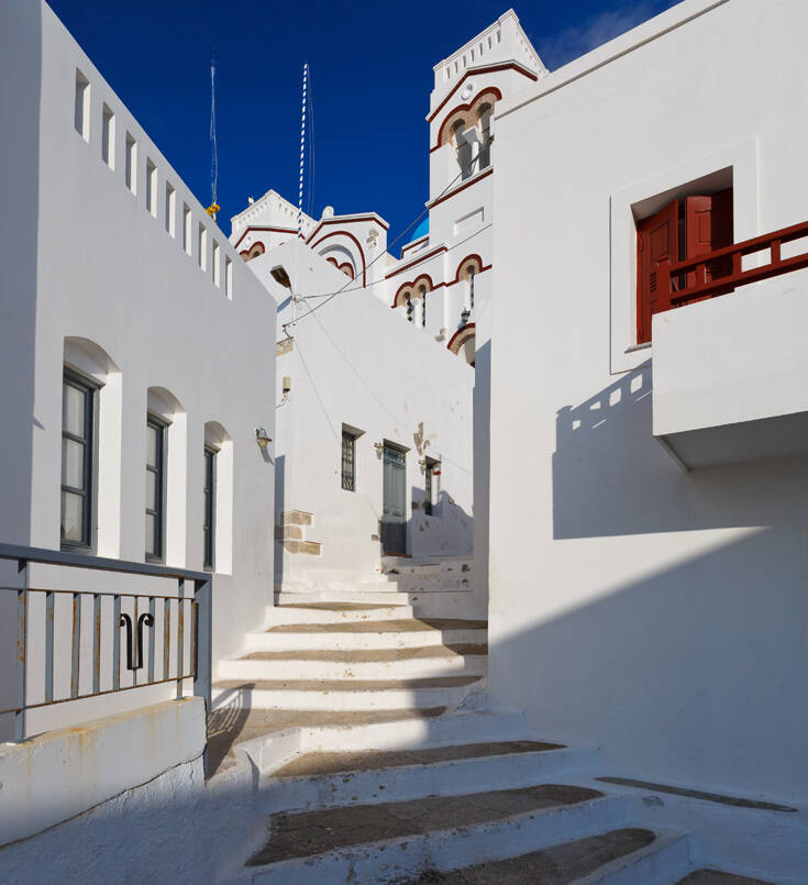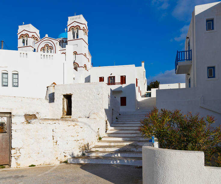 Η όμορφη πλατεία του χωριού είναι το απόλυτο πέρασμα και τα καλοκαιρινά βράδια οι ταβέρνες γεμίζουν κόσμο που απολαμβάνει καλό φαγητό μετά μουσικής. Η θέα, από τη μια μεριά προς την Αιγιάλη κι από την άλλη μεριά προς την παραλία Μικρή Βλυχάδα, αποτυπώνει την εναλλαγή των εποχών και την παντοδυναμία της θάλασσας