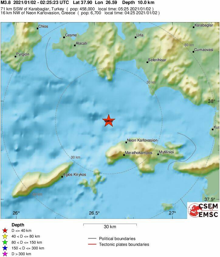 Το ακριβές επίκεντρο της δόνησης εντοπίζεται, 16 χλμ. βοιρειοδυτικά από το Νέο Καρλόβασι, ενώ το εστιακό βάθος του σεισμού υπολογίζεται στα 10 χλμ.
