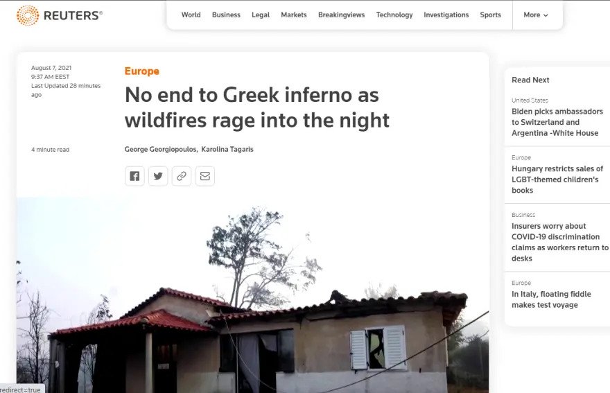 Στον πύρινο εφιάλτη στη χώρα μας - εν μέσω του χειρότερου καύσωνα εδώ και 30 χρόνια - αναφέρεται το Reuters.«Δεν έχει τέλος η πύρινη ''κόλαση'' στην Ελλάδα, καθώς οι φωτιές μαίνονταν μέσα στη νύχτα».