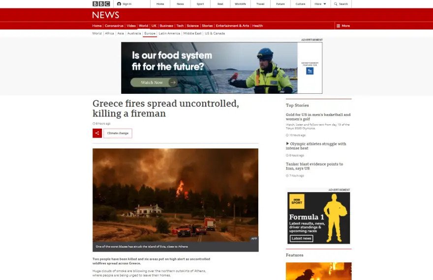 Με τίτλο «Οι φωτιές στην Ελλάδα εξαπλώνονται ανεξέλεγκτα, νεκρός ένας πυροσβέστης», το BBC αναφέρεται στις καταστροφικές φωτιές στην Ελλάδα. «Τεράστια σύννεφα καπνού πλέουν πάνω από τα βόρεια προάστια της Αθήνας, μεταδίδοντας λεπτό προς λεπτό τις εξελίξεις.