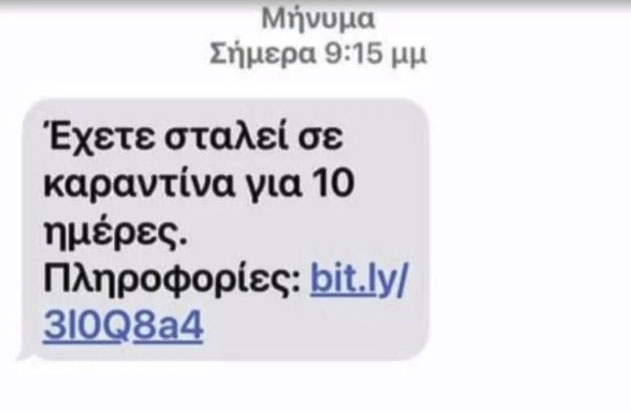 Το επίμαχο μήνυμα ενημερώνει τον χρήστη ότι δήθεν μπαίνει σε καραντίνα, με μια διατύπωση ωστόσο που μαρτυρά την αναξιοπιστία του. «Έχετε σταλεί σε καραντίνα για 10 ημέρες». Ακολούθως, παρατίθεται ένας σύνδεσμος (link) τον οποίο ο χρήστης δεν πρέπει να ακολουθήσει.