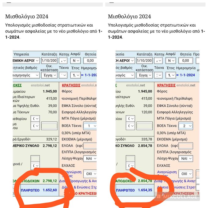 Αριστερά, όπως κοιτάμε, ο υπολογισμός μισθοδοσίας ενός τυχαίου έγγαμου επισμηναγού* με 1 παιδί. Δεξιά, ο ίδιος αξιωματικός με 2 παιδιά. Διαφορά στο πληρωτέο από το 1 στα 2 παιδιά: 1 ευρώ και 75 λεπτά.