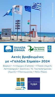 Δήμο Δίου-Ολύμπου, για τέταρτη χρονιά στη σειρά, τιμήθηκαν με «Γαλάζια Σημαία» επτά ακτές, στις δημοτικές ενότητες Ανατολικού Ολύμπου και Λιτοχώρου.