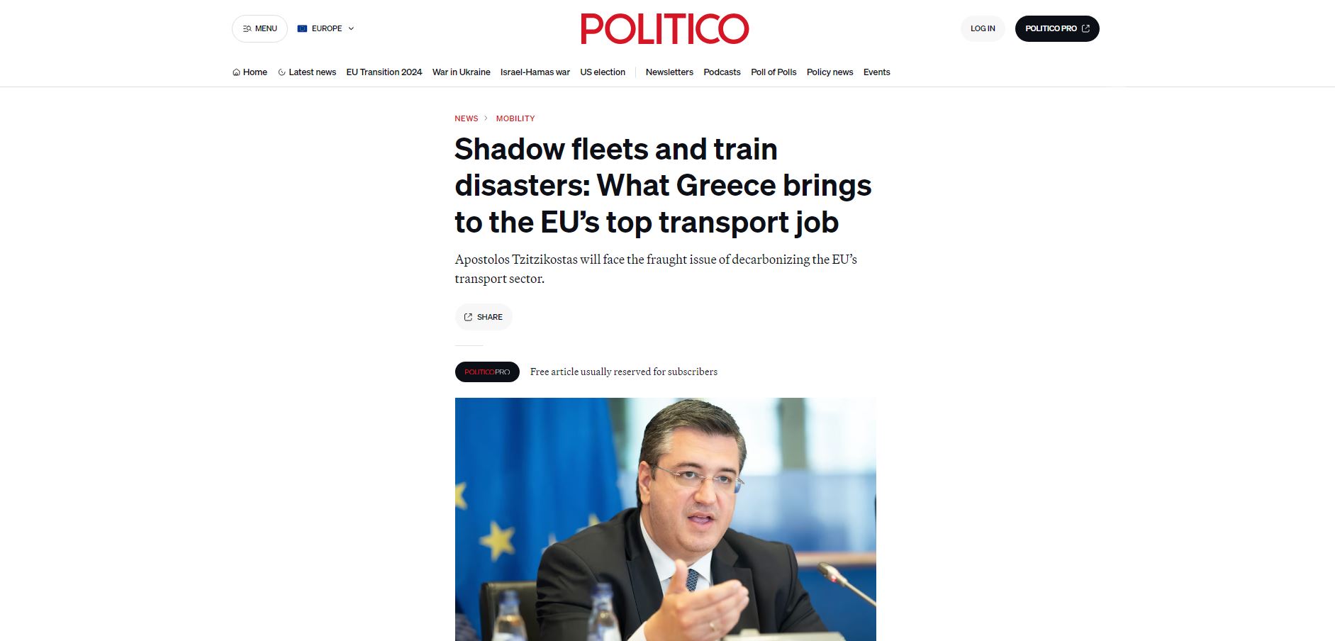 το χαρτοφυλάκιο των μεταφορών της Ευρωπαϊκής Ένωσης» τονίζει σε αποκαλυπτικό του δημοσίευμα με θέμα τον ορισμό του Απόστολου Τζιτζικώστα στη νέα Κομισιόν το Politico.