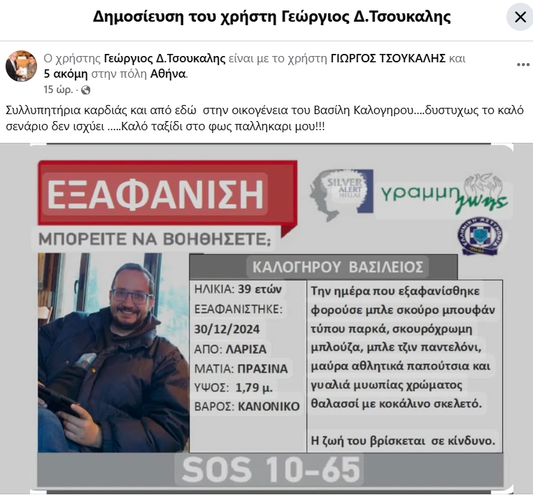 Γιώργος Τσούκαλης, ο οποίος ερευνούσε την εξαφάνιση του Βασίλη Καλογήρου, αποχαιρέτησε τον 39χρονο με μία συγκινητική ανάρτηση στο Facebook.