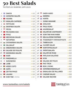 τη νέα λίστα του γαστρονομικού οδηγού Taste Atlas, η Ελλάδα κατέχει πανηγυρικά την πρώτη και τη δεύτερη θέση ανάμεσα στις 100 κορυφαίες σαλάτες παγκοσμίως. Πιο συγκεκριμένα, ο ντάκος φιγουράρει πρώτος, ενώ η αγαπημένη χωριάτικη ακολουθεί, αποδεικνύοντας ότι η ελληνική κουζίνα δεν χρειάζεται πολλά για να ξεχωρίσει, παρά μόνο λίγο λάδι, ντομάτα, ψωμί και φαντασία.