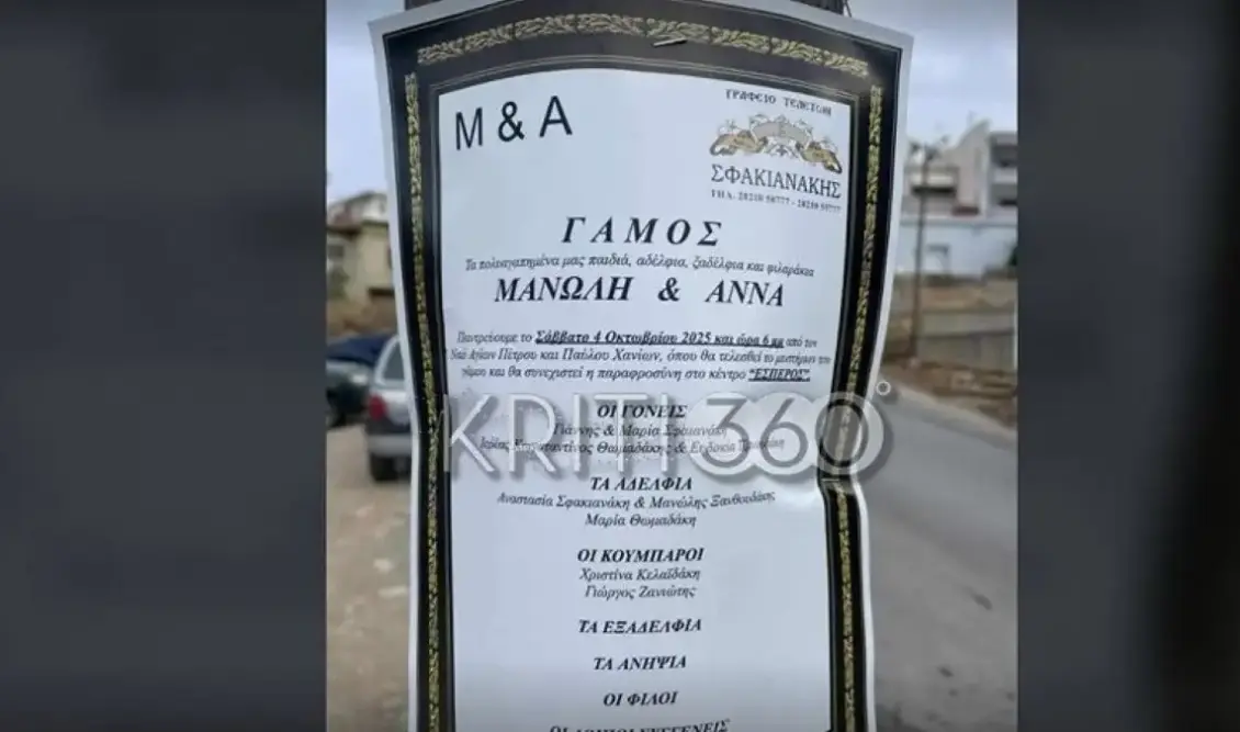 Σύμφωνα με το kriti360.gr, το πρωτότυπο «αγγελτήριο» έχει όλα τα χαρακτηριστικά ενός κηδειόχαρτου – μαύρα γράμματα, επίσημη διάταξη και ύφος αναγγελίας – μόνο που αντί για ημερομηνία θανάτου, αναφέρει την ημερομηνία του γάμου.