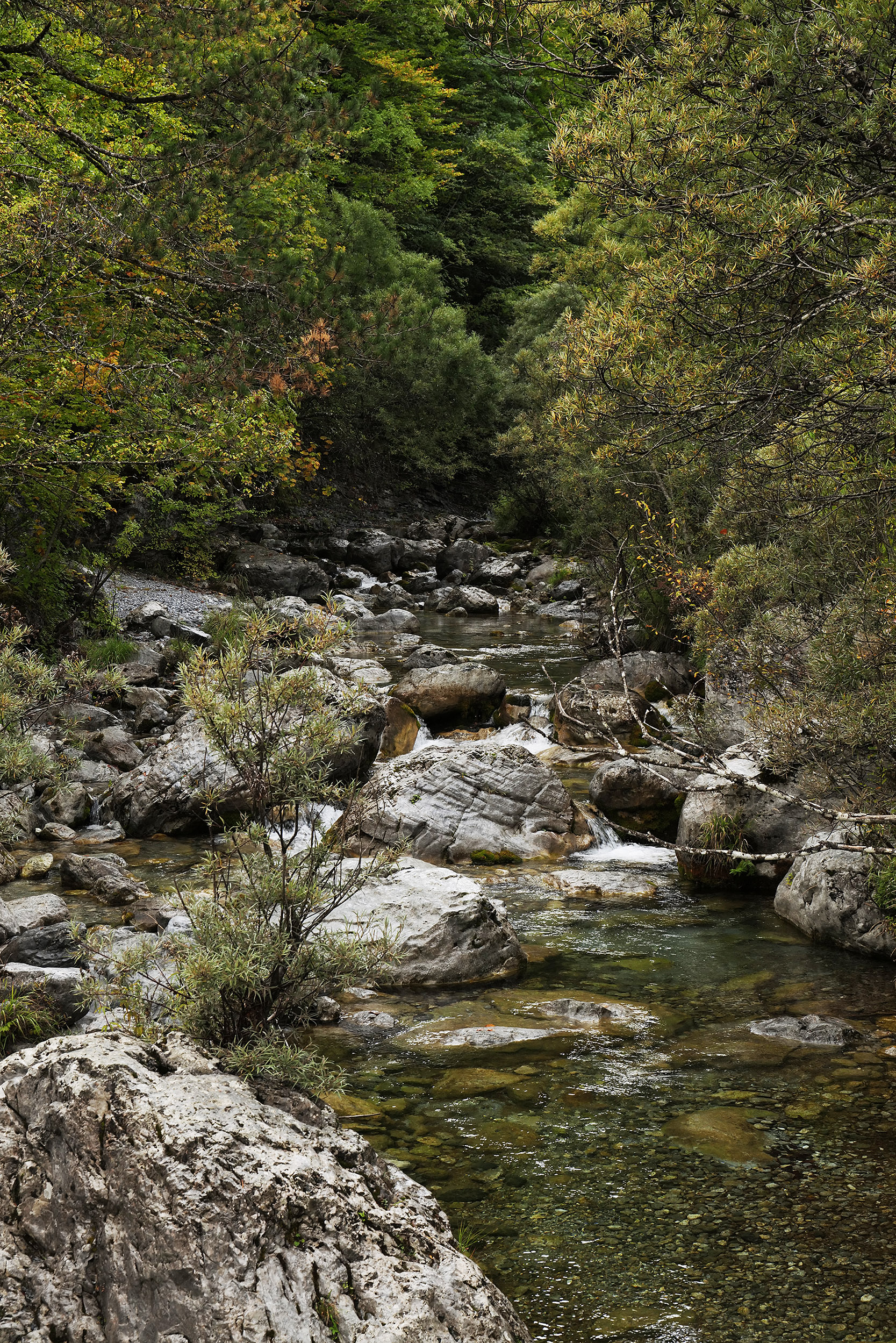 Νωρίς το πρωί της επόμενης, καθώς οδηγούσαμε προς τη θέση Πριόνια, για να παρκάρουμε κοντά στη Παλαιά Μονή του Αγίου Διονυσίου, από όπου θα ξεκινούσαμε μέσα στο μονοπάτι Ε4, η βροχή έπεφτε με μανία, πλένοντας το αυτοκίνητο, κάνοντας τους υαλοκαθαριστήρες να αγκομαχούν. Η διαρκής και απότομη εναλλαγή των καιρικών συνθηκών στους πρόποδες του Ολύμπου, μέσα Οκτωβρίου, μπέρδευε πολλούς πεζοπόρους και περιπατητές, αφού συναντούσαμε αρκετούς στο πλάι του δρόμου, ανέτοιμους για την ξαφνική καταιγίδα, σε μια κατάσταση πρόωρης απελπισίας. Αυτό μου επιβεβαιώνει κάθε φορά το γεγονός όπου, όπως η θάλασσα, έτσι και το βουνό, ζητούν το σεβασμό μας, την ωριμότητα στον τρόπο προσέγγισής τους καθώς και την πολύ καλή και όχι επιπόλαιη προετοιμασία. Για καλή μας τύχη, αμέσως μόλις παρκάραμε το αυτοκίνητο στο ευρύχωρο και εντελώς άδειο πάρκινγκ στην πλάτη της Παλαιάς Μονής, η βροχή έδωσε τη θέση της σε μια μολυβένια, ανάγλυφη συννεφιά, η οποία κράτησε μέσα της τις σταγόνες μέχρι το τέλος της διαδρομής μας, περίπου δύο ώρες αργότερα.