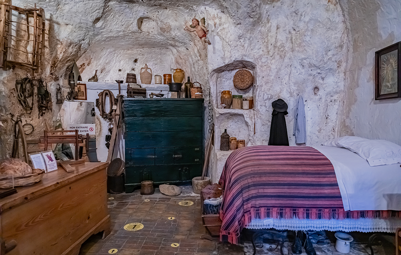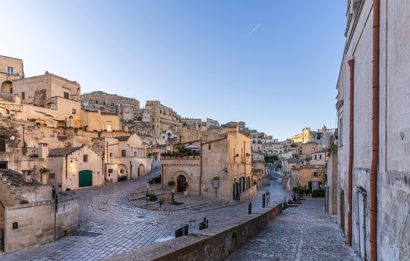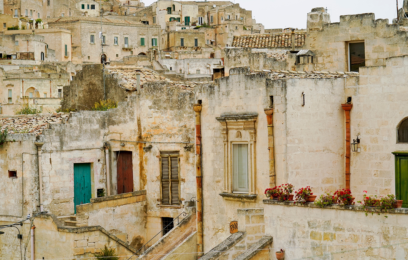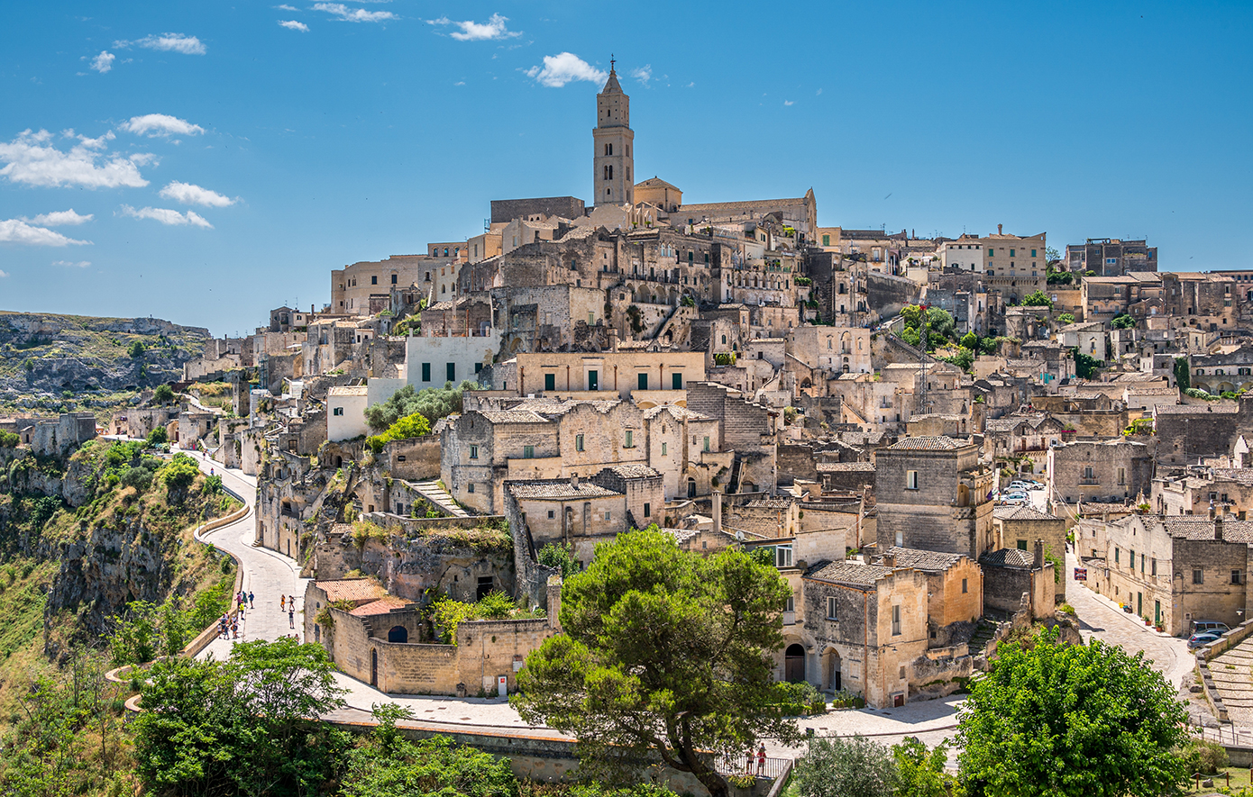 νότια Ιταλία, είναι μια από τις παλαιότερες συνεχώς κατοικημένες πόλεις στον κόσμο -με ανθρώπινη παρουσία που ξεκινά ήδη από τη νεολιθική εποχή. Η καρδιά της, τα περίφημα Sassi, είναι ένα δαιδαλώδες σύστημα κατοικιών, εκκλησιών και σπηλαίων λαξευμένο στο τufa -τον μαλακό ασβεστολιθικό βράχο που χαρίζει στην πόλη το μοναδικό χρώμα και χαρακτήρα της.